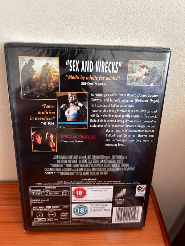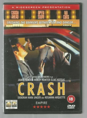 Includes Crash (1996) DVD directed by David Cronenberg, starring James Spader, Holly Hunter, Elias Koteas, and Deborah Kara Unger. This controversial psychological drama explores themes of technology, sexuality, and modern obsession. Region 2 format – suitable for UK/European DVD players. Rated 18 due to strong sexual content and disturbing themes.